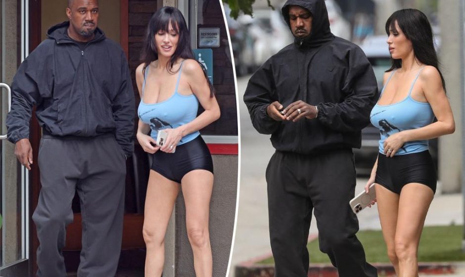 Braless Bianca Censori left little to the imagination in a plunging tank top and black booty shorts while out with her husband, Kanye West.