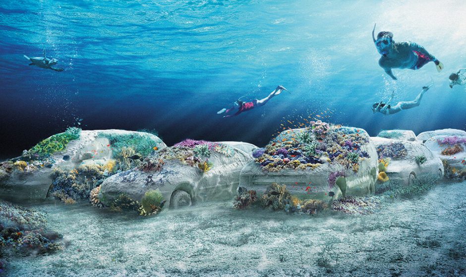 The first deployment, Concrete Coral by Leandro Erlich, features twenty-two full-scale cars submerged fifteen to twenty feet underwater at 4th Street. Cast in marine-grade concrete from 3D-printed molds, the sculptures evoke an underwater traffic jam while providing structure for coral growth. Using Coral Lok, a patented attachment system, live corals are seeded onto the cars to accelerate reef development.