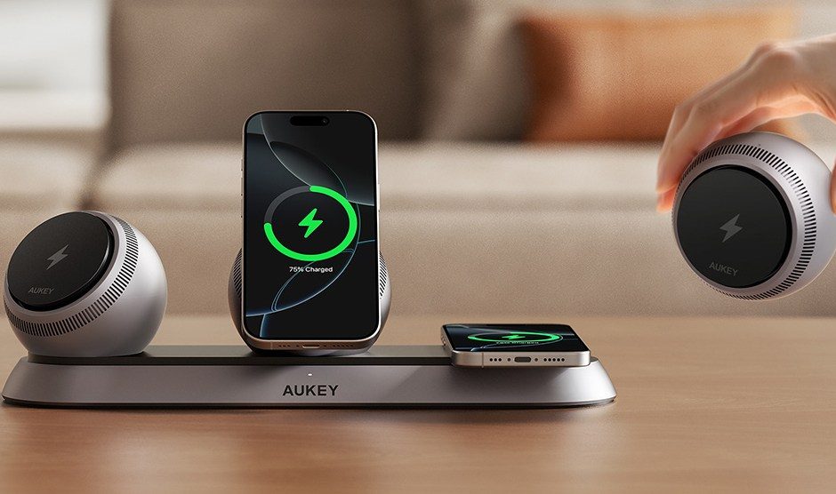 Aukey has announced a new modular charging solution called the MagFusion Ark. It combines a base station featuring up to three Qi2.2 charging pads with spherical power banks that each have their own Qi2.2-compatible pads. The spheres support passthrough charging and can wirelessly charge another device while they’re on the base station, but they can also be removed and used as standalone wireless chargers powered by either their 6,700mAh battery or a USB-C port.