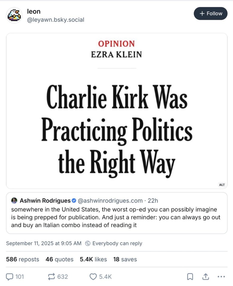 ‣ Case in point: the title of this op-ed about the shooting of right-wing commentator Charlie Kirk, who openly said things like “it’s worth to have a cost of, unfortunately, some gun deaths every single year so that we can have the Second Amendment”: