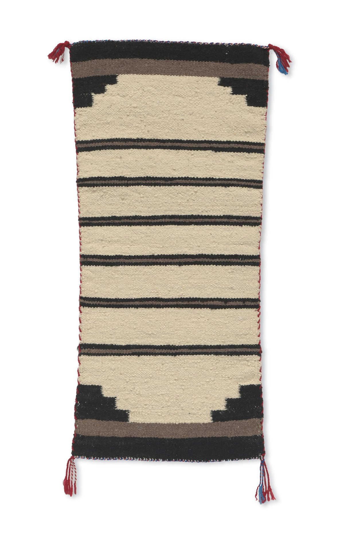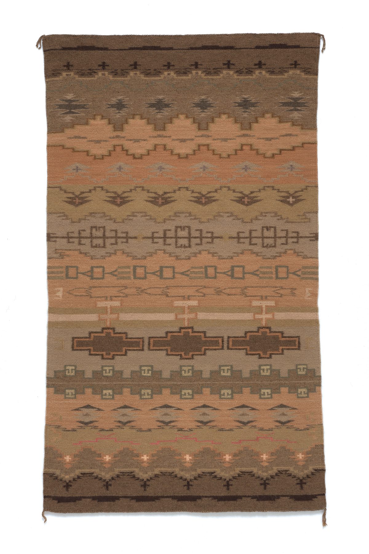 DB: I don’t really know. Most finished weavings, maybe two by three or three by three feet, and some saddle blankets, were taken by my father and my grandfather to the local trading posts to exchange for food, fabric, or whatever was needed. My mother never went to the trading post herself — we didn’t have a vehicle then, so transportation was by wagon or horses. They would roll up the weavings, pack them, and take them to the trading post. I don’t remember what happened to many of my earliest pieces, but there was one on exhibit at the NMAI from 1966. That’s the only one that I know.