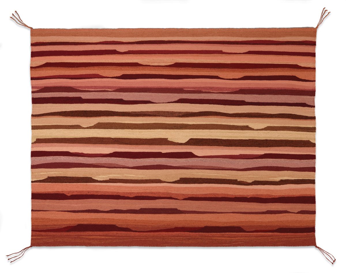 For over four decades, artist DY Begay expanded the expressive range of Diné (Navajo) weaving, transforming the form into a language that is entirely her own. She is a Diné Asdzą́ą́ (Navajo woman), born to the Tótsohnii (Big Water) clan and born for the Táchii’nii (Red Running into Water/Earth) clan. Her maternal grandfather is of the Tsénjíkiní (Cliff Dweller) clan and her paternal grandfather is of the Áshįįhí (Salt People) clan.